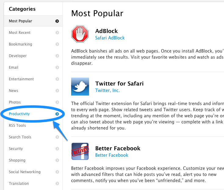 - Safari Extensions Gallery のページが開くので、左の「Categories」から「Productivity」を選択します。