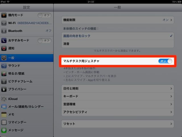 「設定」⇒「一般」⇒「マルチタスク用ジェスチャ」