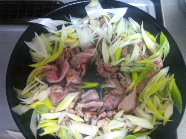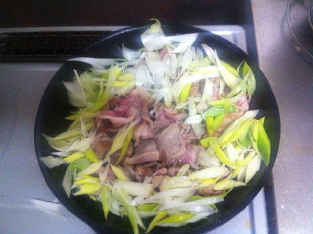 - 豚肉の片面が焼けたら、長ねぎを投入!