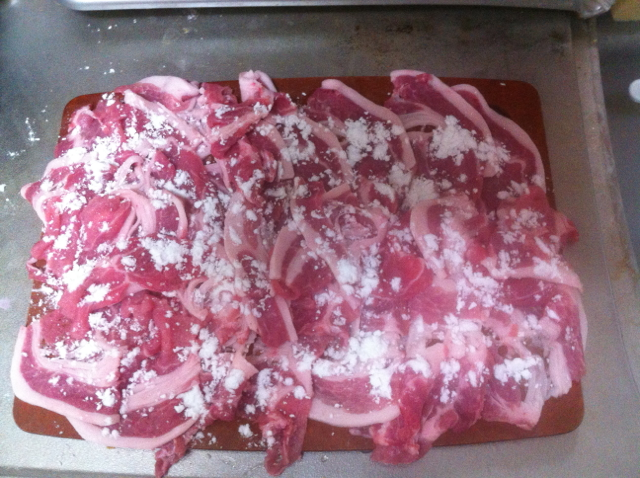 - 豚肉を子どもが食べやすい大きさに切り、片栗粉をまぶします