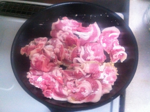 - フライパンに豚肉をドスンと全部入れて、片面を焦げ色がつくぐらいまで焼きます
