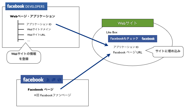 facebook ページと ウェブサイトを連携するには、facebook developers で Webサイトをひとつのアプリケーションとして作成し、登録する必要があります。その Webサイトのアプリには、Webサイトの情報を登録し、その情報を元に ウェブサイトに設置した Like Box が facebookページと連携できるようになります。