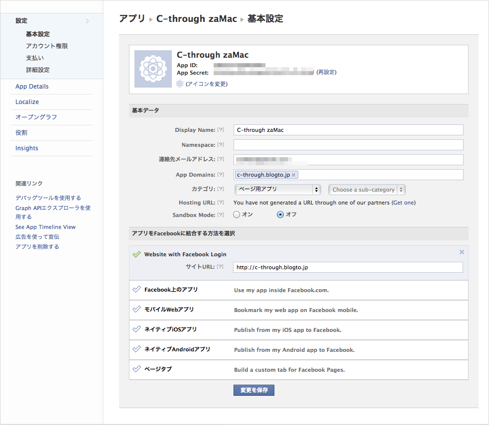 | App Domains | 連携する Webサイトのドメイン (http:// を除いたアドレス) を入力します。 |
