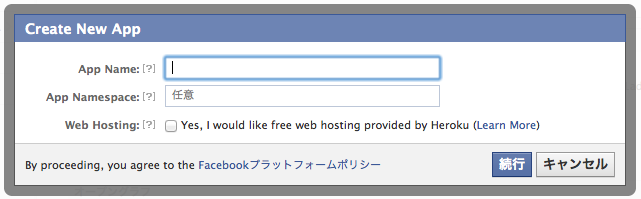 - 「Create New APP」というポップアップがあがるので、それぞれに以下を入力します。