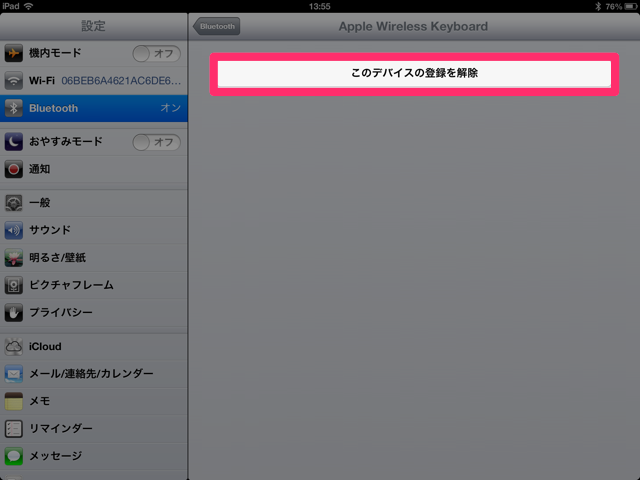 解除する方法も書いておきますね。直接的な解除ではないのですが、一番簡単な方法は Bluetooth の設定画面で Bluetooth をオフにすることです。