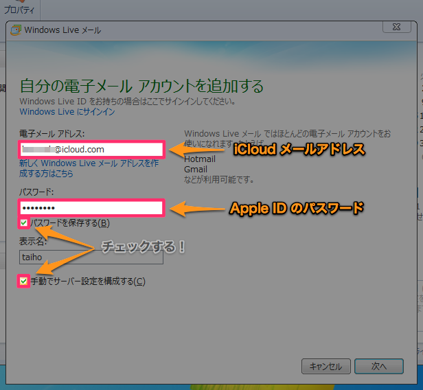 Windows Live メールで iCloud メールを設定する