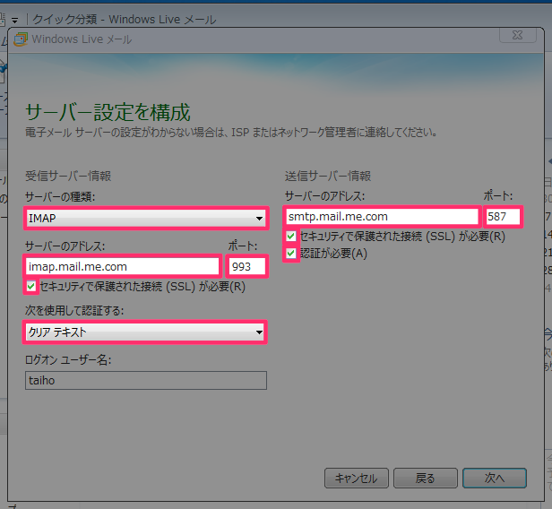 これで、Windows 7 の Windows Live メールからでも iCloud メールを確認できる! と思い設定いたしました。