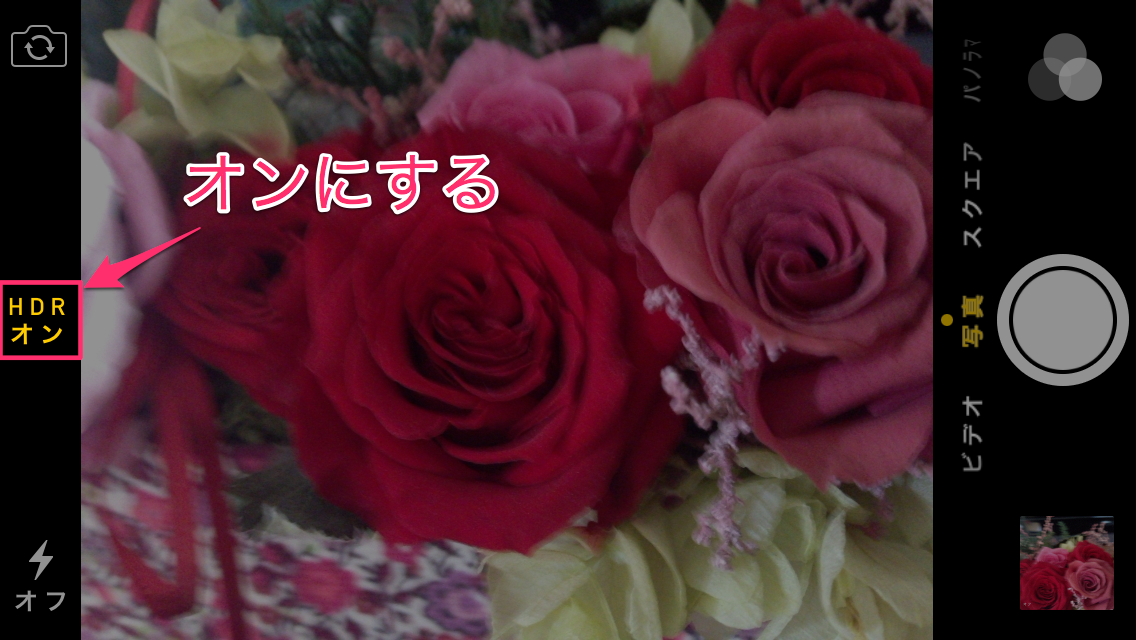 HDR モード撮影にするには、カメラを起動し左に "HDR" の項目があるので、タップして「オン」にします。