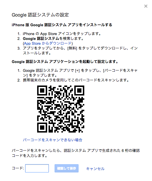 すると、"Google 認証システムの設定" というポップアップが表示されます。