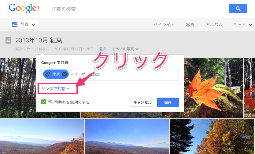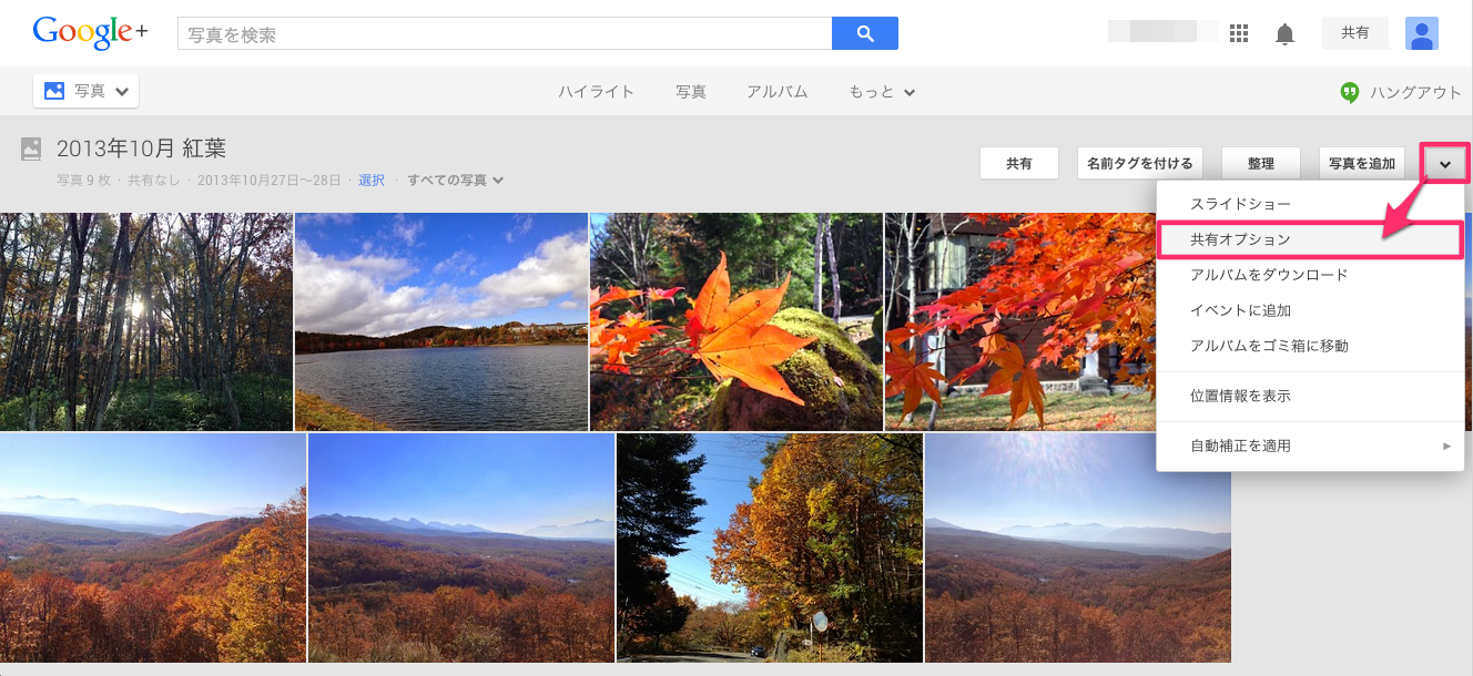Google+ ウェブページ から「写真」⇒「アルバム」と選択し、共有したいアルバムをクリックします。