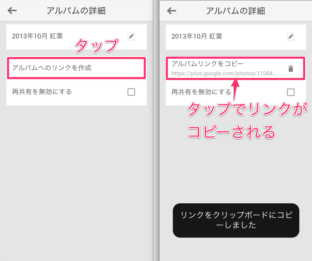 URL リンクが作成されていない場合、「アルバムへのリンクを作成」と表示されていますのでそこをタップしてリンクを作成し、「アルバムリンクをコピー」を再度タップするとリンクをコピーできます。