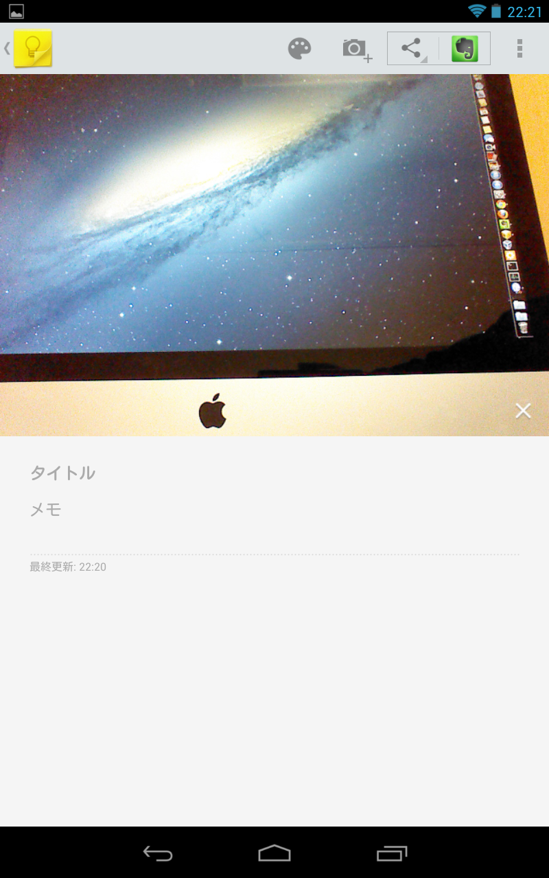 するとカメラが起動しますので、写真を撮れば自動で写真が取り込まれたメモが作成されます。タイトルと文章を追記することもできます。