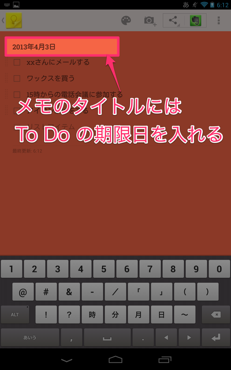 そこで、メモのタイトルに To Do 期限となる年月日を入れましょう。『今日中』のメモだったら、作成時に今日の日付 (例えば「2013年4月3日」) をタイトルに入力します。