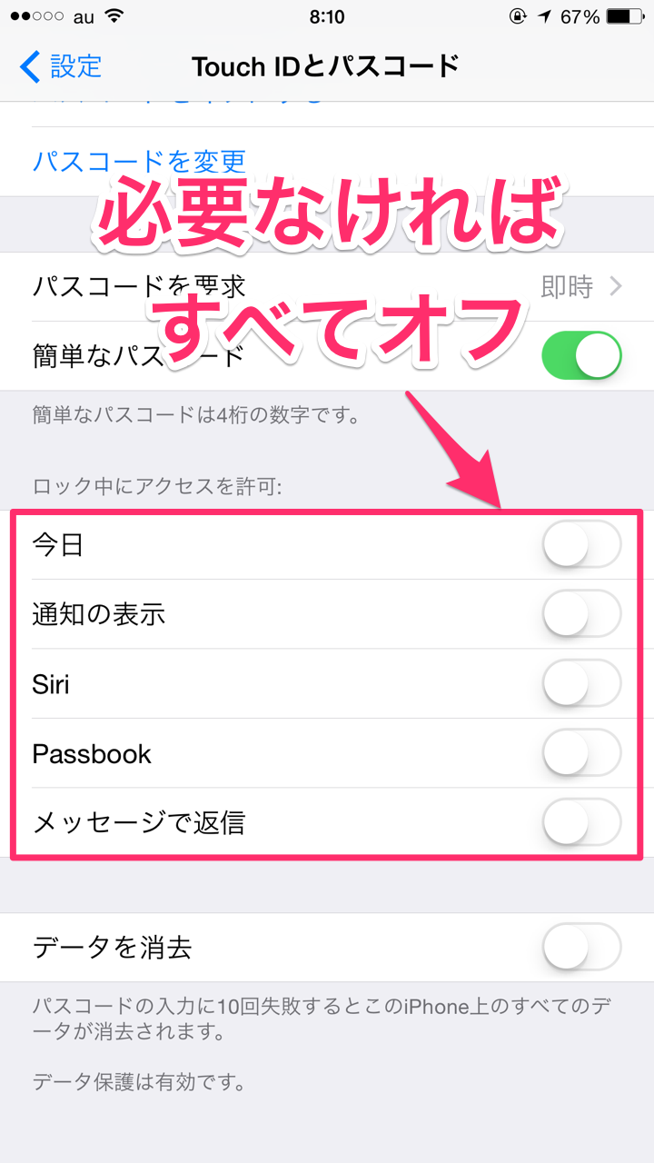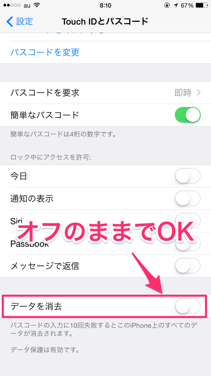 これは、その名の通りパスコード入力を 10回間違ってしまうと、危険なアクセスにさらされていると判断し、データをすべて消去する機能です。