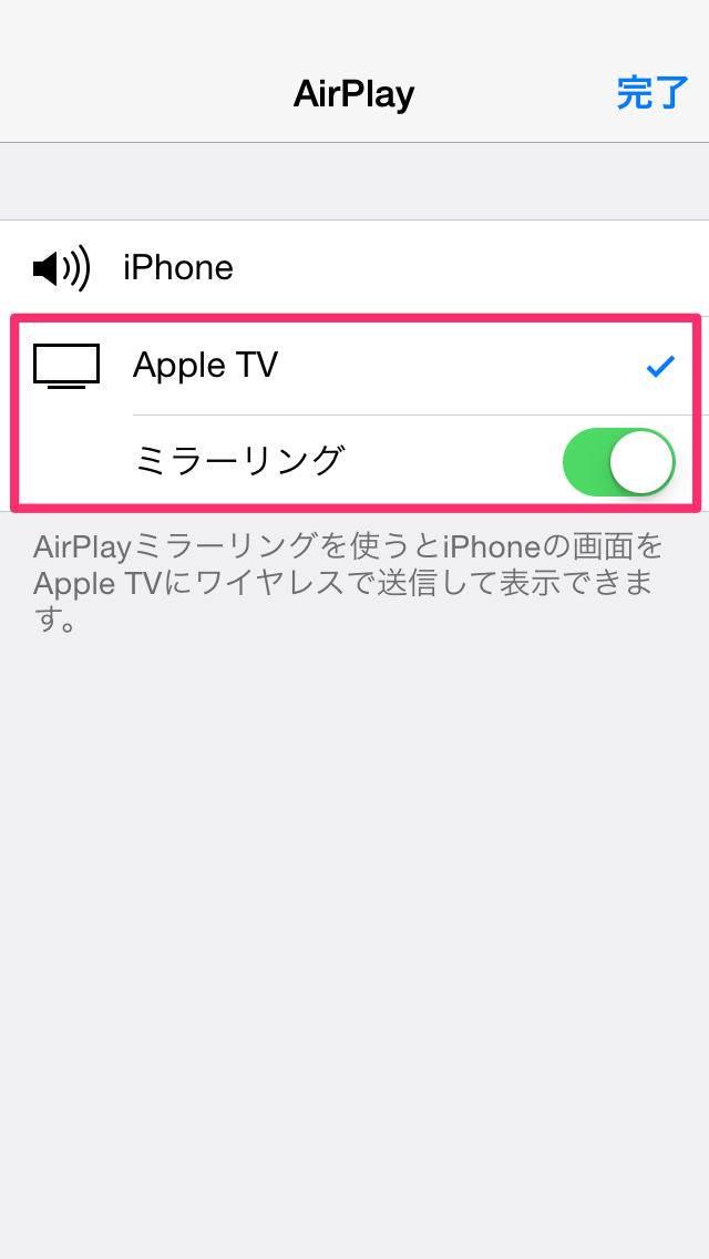 次の画面で「Apple TV」を選択し、「ミラーリングが オン」となっていることを確認しましょう。