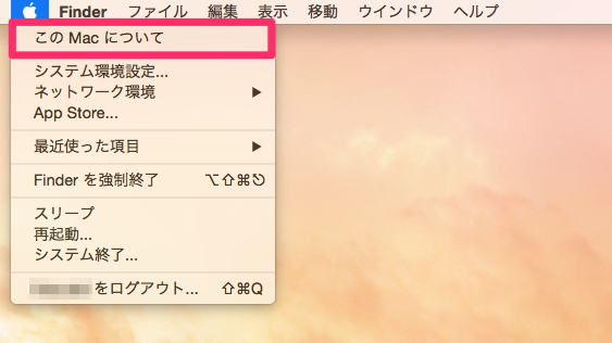 左上のAppleロゴ () マークをクリックし、「この Mac について」を選択します。